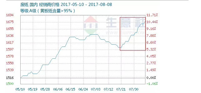 △生意社統(tǒng)計(jì)的從2017年5月10日至8月8日廢紙行情走勢(shì)